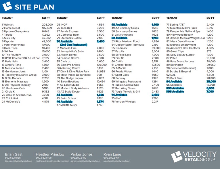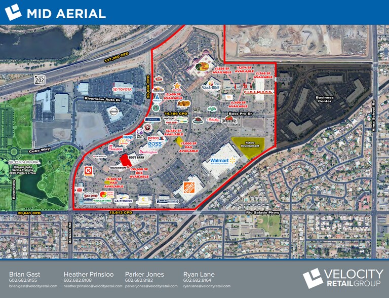 Availability of this property for rent is subject to prior rental or withdrawal of the property from the market at any time without notice. The Mesa Riverview is a Power Center shopping center anchored by Bass Pro Shops, CineMark Theaters, Wal-Mart Super Center, and Home Depot. Access via two full diamond interchanges on Loop 202, at Dobson Rd & at Alma School Rd, and a half-diamond interchange at 8th Street (Rio Salado Parkway). Estimated 2010 traffic counts: Loop 202 @ Dobson = 150,217 cars/day, Loop 202 @ Alma School = 111,487 cars/day, Dobson - South = 19,267 cars/day, Alma School - South = 24,002 cars/day. The shopping center is adjacent to Lowes Enterprise's 45.9-acre office development, with more than 500.000 SF of office space, and an estimated 6-7 thousand employees, to the East. It is also adjacent to a 33-acre auto park, at the Southwest quadrant of Loop 202 & Dobson Rd. SEC Loop 202 & Dobson Rd Availability of this property for rent is subject to prior rental or withdrawal of the property from the market at any time without notice. The Mesa Riverview is a Power Center shopping center anchored by Bass Pro Shops, CineMark Theaters, Wal-Mart Super Center, and Home Depot. Access via two full diamond interchanges on Loop 202, at Dobson Rd & at Alma School Rd, and a half-diamond interchange at 8th Street (Rio Salado Parkway). Estimated 2010 traffic counts: Loop 202 @ Dobson = 150,217 cars/day, Loop 202 @ Alma School = 111,487 cars/day, Dobson - South = 19,267 cars/day, Alma School - South = 24,002 cars/day. The shopping center is adjacent to Lowes Enterprise's 45.9-acre office development, with more than 500.000 SF of office space, and an estimated 6-7 thousand employees, to the East. It is also adjacent to a 33-acre auto park, at the Southwest quadrant of Loop 202 & Dobson Rd.Mesa RiverviewFacts about the mixed-use development 6/28/08 Covers 250 acres with 1.3 million square feet of retail space, 90 percent of which is leased. In contrast, Tempe Marketplace covers 117 acres, with 1.3 million square feet of retail space. Includes plans for three auto SEC Loop 202 & Dobson Rd Availability of this property for rent is subject to prior rental or withdrawal of the property from the market at any time without notice. The Mesa Riverview is a Power Center shopping center anchored by Bass Pro Shops, CineMark Theaters, Wal-Mart Super Center, and Home Depot. Access via two full diamond interchanges on Loop 202, at Dobson Rd & at Alma School Rd, and a half-diamond interchange at 8th Street (Rio Salado Parkway). Estimated 2010 traffic counts: Loop 202 @ Dobson = 150,217 cars/day, Loop 202 @ Alma School = 111,487 cars/day, Dobson - South = 19,267 cars/day, Alma School - South = 24,002 cars/day. The shopping center is adjacent to Lowes Enterprise's 45.9-acre office development, with more than 500.000 SF of office space, and an estimated 6-7 thousand employees, to the East. It is also adjacent to a 33-acre auto park, at the Southwest quadrant of Loop 202 & Dobson Rd.Mesa RiverviewFacts about the mixed-use development 6/28/08 Covers 250 acres with 1.3 million square feet of retail space, 90 percent of which is leased. In contrast, Tempe Marketplace covers 117 acres, with 1.3 million square feet of retail space. Includes plans for three autom SEC Loop 202 & Dobson Rd Availability of this property for rent is subject to prior rental or withdrawal of the property from the market at any time without notice. SEC Loop 202 & Dobson Rd Availability of this property for rent is subject to prior rental or withdrawal of the property from the market at any time without notice. SE Dobson & 202 Loop Availability of this property for rent is subject to prior rental or withdrawal of the property from the market at any time without notice. The Mesa Riverview is a Power Center shopping center anchored by Bass Pro Shops, CineMark Theaters, Wal-Mart Super Center, and Home Depot. Access via two full diamond interchanges on Loop 202, at Dobson Rd & at Alma School Rd, and a half-diamond interchange at 8th Street (Rio Salado Parkway). Estimated 2010 traffic counts: Loop 202 @ Dobson = 150,217 cars/day, Loop 202 @ Alma School = 111,487 cars/day, Dobson - South = 19,267 cars/day, Alma School - South = 24,002 cars/day. The shopping center is adjacent to Lowes Enterprise's 45.9-acre office development, with more than 500.000 SF of office space, and an estimated 6-7 thousand employees, to the East. It is also adjacent to a 33-acre auto park, at the Southwest quadrant of Loop 202 & Dobson Rd.Mesa RiverviewFacts about the mixed-use development 6/28/08 Covers 250 acres with 1.3 million square feet of retail space, 90 percent of which is leased. In contrast, Tempe Marketplace covers 117 acres, with 1.3 million square feet of retail space. Includes plans for three auto SE Dobson & 202 Loop Availability of this property for rent is subject to prior rental or withdrawal of the property from the market at any time without notice. The Mesa Riverview is a Power Center shopping center anchored by Bass Pro Shops, CineMark Theaters, Wal-Mart Super Center, and Home Depot. Access via two full diamond interchanges on Loop 202, at Dobson Rd & at Alma School Rd, and a half-diamond interchange at 8th Street (Rio Salado Parkway). Estimated 2010 traffic counts: Loop 202 @ Dobson = 150,217 cars/day, Loop 202 @ Alma School = 111,487 cars/day, Dobson - South = 19,267 cars/day, Alma School - South = 24,002 cars/day. The shopping center is adjacent to Lowes Enterprise's 45.9-acre office development, with more than 500.000 SF of office space, and an estimated 6-7 thousand employees, to the East. It is also adjacent to a 33-acre auto park, at the Southwest quadrant of Loop 202 & Dobson Rd.Mesa RiverviewFacts about the mixed-use development 6/28/08 Covers 250 acres with 1.3 million square feet of retail space, 90 percent of which is leased. In contrast, Tempe Marketplace covers 117 acres, with 1.3 million square feet of retail space. Includes plans for t
