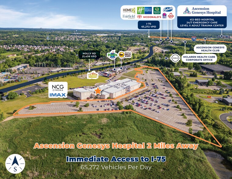 NCG Cinema is two miles from Ascension Genesys Hospital, a 412-bed facility with 24/7 emergency care and a Level II adult trauma center. The hospital is a primary employer in the area and has a large health club facility on campus, offering a variety of sports and health services to the community. Also nearby is McLaren Health Care Corporate Headquarters, a 65,000-square-foot office built in 2017.