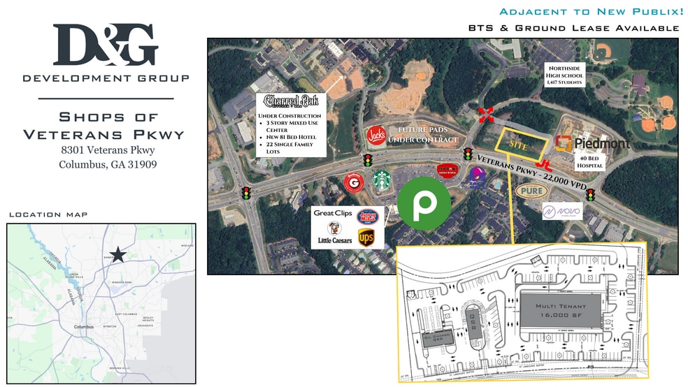 This new retail development includes both build-to-suit multi-tenant space and standalone pads. Located on the north end of Columbus adjacent to a brand new Publix, this area of Columbus is the fastest growing area over the past 5 years. The Publix opened in 2023 and is already in the top 22% for the state per PlacerAI. Brand new 55 bed Piedmont hospital just opened on the parcel next door.