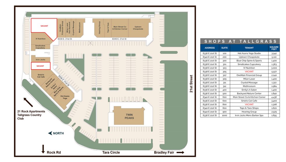 - Situé à l'est de Rock Road sur la 21st St. N - 2023 NNN Estimation 8,25$ /pip - Nombre de trafic : 43 326 VPD à 21st & Rock - Voisins de grandes boîtes de vente au détail telles que Dillion's, Trader Joe's, Best Buy et Bradley Fair Development, qui comprend Pottery Barn et Barns & Noble, tous qui créent une synergie de vente au détail !