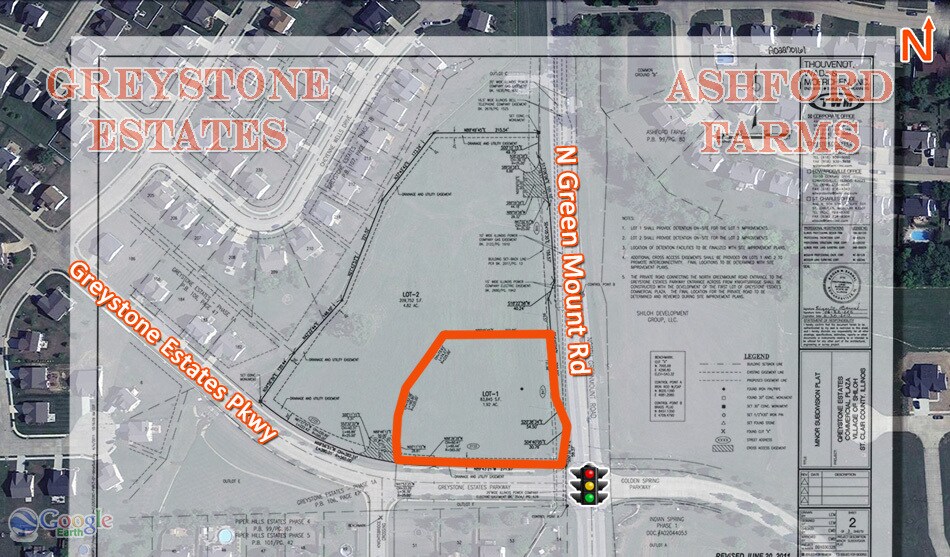 High Profile 1.92 Acre Neighborhood Development Site on Green Mount Road. 273 ft frontage at lighted entrance to Greystone Estates (hard corner). 19,000 ADT. Located near Dierberg’s, Target and Shiloh’s newly developed retail district off of Green Mount Rd and I-64. Short distance from the New Memorial and St. Elizabeth’s (2017) Hospitals. Less than 1 Mile to I-64, Exit 16. *The 4.73 Acre parcel to the North is also available for sale. All utilities on site.