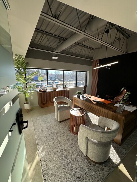 Espace de bureau joliment rénové avec des planchers de béton poli, des murs de verre et une cuisinette