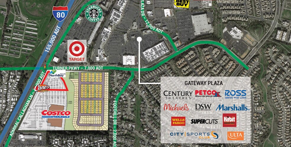 Possibilités de QSR, de pavé et d'endcap Fairview Plaza — un complexe costco ancré sur la I-80. Fairview Plaza est un projet de développement d'autoroute visible, ancré par Costco, et adjacent à une nouvelle résidence de haute qualité communauté. Stratégiquement située sur Admiral Callaghan Lane, la propriété en question bénéficie de sa proximité avec de nombreux détaillants à volume élevé, notamment Target, Century Theatres, Home Depot, Safeway, Best Buy, Chick-Fil-A et Ross Dress for Less. • Idéal pour les utilisateurs qui recherchent une visibilité sur l'autoroute et une forte colocation de détail • Entouré d'une population dense de 154 000 personnes et plus avec un revenu moyen des ménages de 97 000 $+ dans un rayon de cinq (5) milles • Trafic quotidien moyen de l'I-80 : 155 000 et plus • Situé le long du corridor principal de vente au détail
