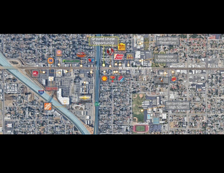 Positioned at a signalized intersection with direct access to Freeway 259, 850 W Highland Avenue offers a rare ground lease opportunity in the heart of San Bernardino’s thriving commercial corridor. The 21,372 SF parcel sits on a highly visible corner, surrounded by national retailers including McDonald's, AutoZone, KFC, and Home Depot, and is near to key educational institutions such as San Bernardino High School, Arrowview Middle School, and George Brown Elementary. The site currently features a 5,778 SF building that may be demolished to accommodate new development, making it ideal for a wide range of retail, QSR, medical, or service-oriented uses. With traffic counts exceeding 90,000 cars per day across Highland Avenue and FWY 259, the property benefits from exceptional exposure and accessibility. The surrounding area boasts a dense and diverse population, with over 340,000 residents within a 5-mile radius and a strong Hispanic demographic presence. This location is further enhanced by proximity to the major freeways of Interstate 215 and 210. The parcel’s strategic positioning and flexible redevelopment potential make it a compelling choice for tenants seeking long-term brand visibility and market penetration in the Inland Empire.