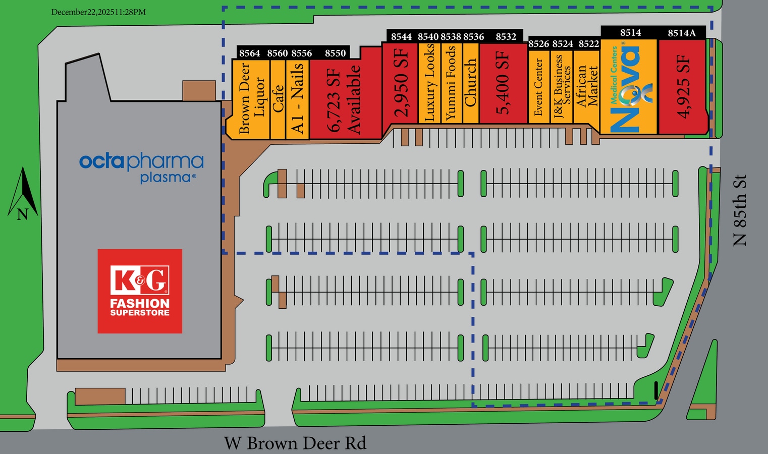 Les quelque 43 000 SF Shops de Highland Plaza sont situés à Milwaukee, Wisconsin. Cette propriété est ancrée par K&G Fashion Superstore et Octapharma. Les magasins de Highland Plaza sont situés stratégiquement à l'intersection de coins durs et signalés du chemin W. Brown Deer et de la 85e Rue N.. Les suites commerciales de ce centre sont disponibles à la location pour n'importe quoi, qu'il s'agisse de magasins de détail traditionnels et de restaurants, de bureaux ou de fournisseurs de services médicaux ou autres professionnels. Woodcrest Capital accueille les entreprises pour la première fois et les franchises dans ses centres avec des baux faciles à lire et des modalités flexibles, tout en étant suffisamment sophistiquée pour plaire aux plus grands locataires de crédit nationaux. En tant qu'entreprise familiale ayant plus de 40 ans dans l'immobilier commercial, Woodcrest possède et exploite tout, des centres de classe A dans les quartiers les plus achalandés aux centres en difficulté qu'elle réhabilite dans les collectivités rurales en difficulté. Appelez-nous dès aujourd'hui pour trouver le bon endroit pour votre entreprise, car nous avons généralement de multiples occasions de vente au détail dans les environs immédiats !