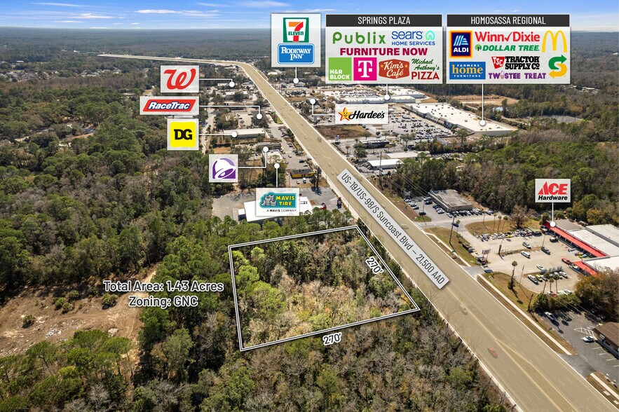 Positioned directly on US Hwy 19/98 in the heart of Homosassa, this 1.43± acre GNC commercial parcel offers 270± feet of prime highway frontage with exceptional visibility and direct exposure to 21,500 vehicles per day. Located within the Tampa–St. Petersburg–Clearwater MSA, the 18th largest MSA in the United States, the site sits in the center of Citrus County’s most established and rapidly expanding retail corridor.