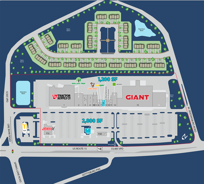 Dillsburg Shopping Center est un centre commercial de détail de 153 088 pieds carrés situé le long de la route 15 à Dillsburg, en PA. Le projet est à double ancre par Giant Food Stores et Tractor Supply Co., tout en mettant en vedette d'autres marques nationales comme Rite-Aid, Dollar Tree, Fulton Bank, Verizon et Advance Auto Parts, pour n'en nommer que quelques-unes. Le centre commercial Dillsburg est un incontournable pour le marché de Dillsburg en tant que seul centre commercial de détail ancré dans l'épicerie dans les environs immédiats. Grâce à son fort mélange de locataires nationaux et locaux, il s'agit d'un excellent projet pour tout détaillant. Les frais de NNN sont de 4,20$ par FS.