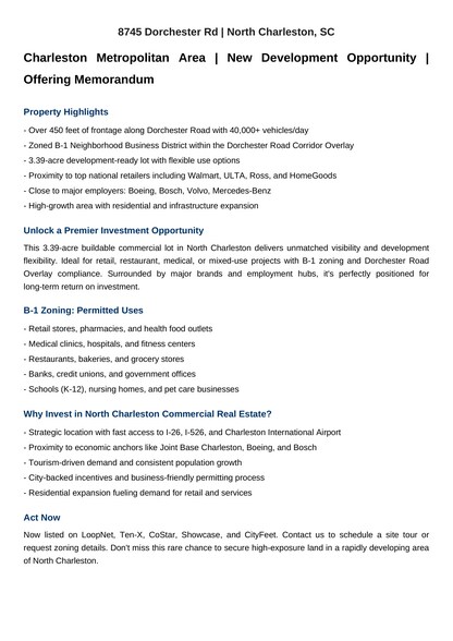 Ce terrain commercial à vendre est une découverte rare sur le marché en pleine croissance de North Charleston. Sa proximité avec les grands détaillants et son trafic élevé en font un lieu d'affaires lucratif pour les entrepreneurs et les investisseurs à la recherche de propriétés commerciales à rendement élevé. La poussée de développement du corridor routier Dorchester, combinée aux avantages du zonage B-1 de la propriété, assure un équilibre entre rentabilité et harmonie communautaire. Que vous planifiez un carrefour pour petites entreprises, un complexe de cabinets médicaux ou un développement à usage mixte, ce site offre la base parfaite.
