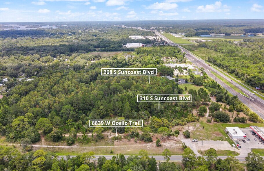 Terrain constructible vacant et EMPLACEMENT DE CHOIX ! Cette propriété commerciale de 10,80 acres comprend environ 3,2 acres zonées GNC, environ 4,75 des terres sont zonées LDR et 2,85 acres zonées CL semblent être des terres humides. Il y a de nombreuses possibilités ici d'aménager ce terrain ou de construire et d'agrandir votre entreprise avec environ 210 pieds de façade routière située sur la plus grande route de la côte ouest de la Floride (23 000 AADT) et plus de 1 000 pieds carrés de façade sur le célèbre sentier Ozello. La célèbre Ozello Keys est nichée entre Homosassa Springs et Crystal River, et est accessible par cette route, l'une des routes les plus pittoresques de Floride, où la pêche et les restaurants sont populaires. Avec un accès facile à la route 589 à péage nouvellement ouverte et à la promenade Suncoast (6 milles), ce qui en fait un trajet facile jusqu'à l'aéroport international de Tampa et à 2 minutes de l'aéroport régional de Crystal River. Crystal River est une communauté florissante, avec une économie locale forte et une population croissante. L'emplacement stratégique de la ville, son style de vie dynamique et sa beauté naturelle en font une destination attrayante pour les résidents et les touristes. Ne manquez pas cette occasion avec des options pour acheter d'autres parcelles avoisinantes au sud, le 310 S Suncoast Blvd et le 268 S Suncoast Blvd. Avec l'approbation du comté, le zonage GNC autorise les logements multifamiliaux, les utilisations institutionnelles, les loisirs de plein air, les installations de service public, les immeubles à bureaux, les commerces de quartier et la plupart des utilisations commerciales complètes. Les possibilités sont presque illimitées !