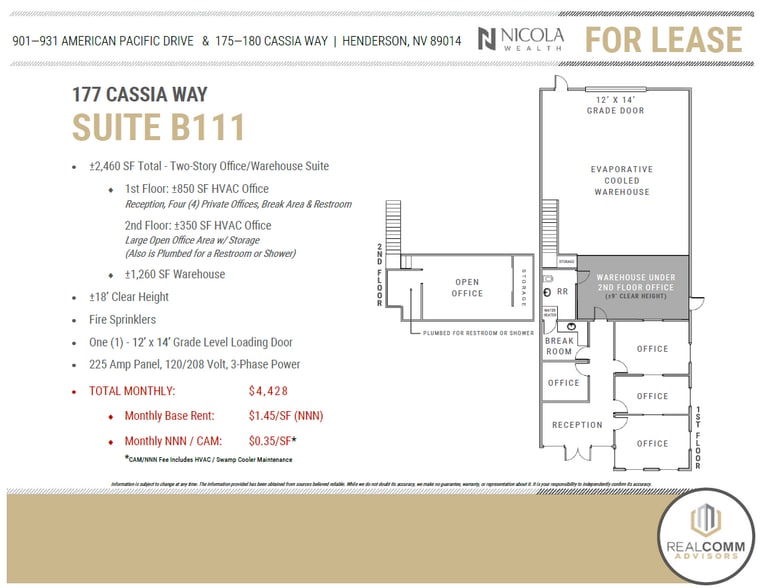 Base Rent: $1.45/SF + NNN Fees: $0.35/SF* = $4,428 Total Monthly (Plus Utilities) *CAM/NNN Fee Includes HVAC / Swamp Cooler Maintenance Suite B111 is 2,460 SF Total - Office/Warehouse that includes a total of 1,200 SF Two-Story Office Space (1st Floor: 850 SF w/ a Reception Area, Four (4) Private Offices, Break Area & Restroom - 2nd Floor: 350 SF w/ a Large Open Office Area w/ Storage, also is plumbed for a restroom or shower). 1,260 SF Evaporative Cooled Warehouse, 18' Clear Height, One (1) 12' x 14' Grade Door, Fire Sprinklers & 225 Amp Panel, 120/208 Volt, 3-Phase Power. Please contact Brokers to view.