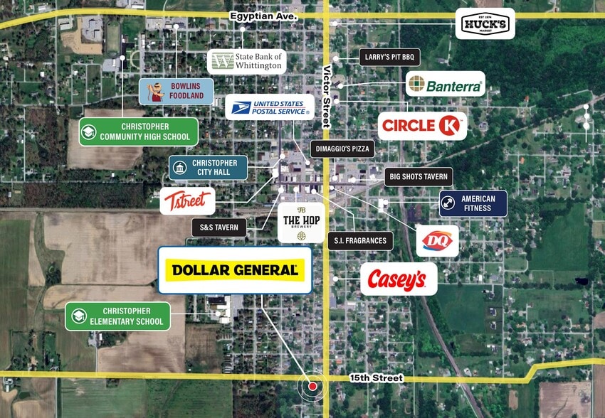 - Approximately 100 miles southeast of St. Louis and at hard corner along Victor Street (IL Route 148), the primary north-south corridor
