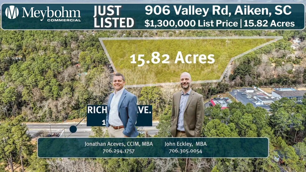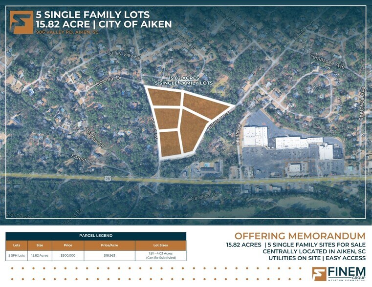 The Finem Group at Meybohm Commercial is pleased to exclusively present 15.82 acres at 906 Valley Rd in Aiken, SC. Zoned RC and subdivided into five large single-family residential lots, this property offers a strategic opportunity for infill development in a well-connected area of Aiken. With access to public utilities at the street and gentle elevation changes across the site, the lots are ideal for new home construction. This listing represents a rare opportunity to acquire residential land in an established corridor with close proximity to regional employers, healthcare, and downtown Aiken. Located just 1.8 miles from the center of Aiken, SC, this residential site offers quick access to Aiken-Augusta Highway (Richland Ave W), Carolina Drive, and the broader CSRA. Nearby amenities include grocery centers, schools, and healthcare facilities, all within a 5-minute drive. The area is surrounded by established neighborhoods and benefits from its proximity to both commercial services and natural greenspace.