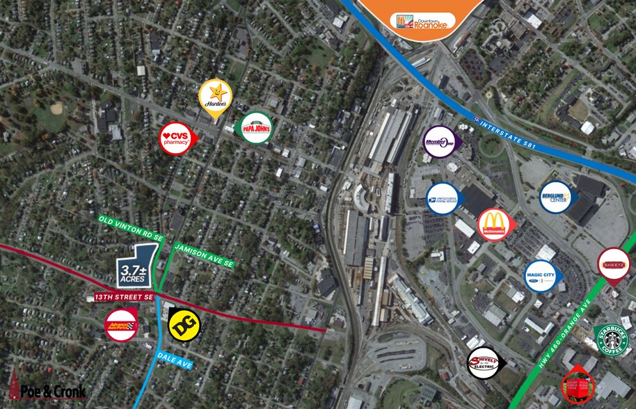 7 propriétés adjacentes de la 13e rue et 3 propriétés adjacentes de la 12e rue se combinent pour fournir une parcelle de 3,74 acres située à l'angle des rues 13th et Jamison. Zoné Cn - Quartier commercial et Rm1 résidentiel. Emplacement au coin d'un feu de signalisation. Comptage de 25 000 véhicules. Les services publics sont disponibles sur le site. Vdot commence actuellement à travailler sur le prolongement de la 13e rue jusqu'au chemin Hollins reliant l'avenue Orange, ce qui en fait un site encore plus accessible. Lots de niveau