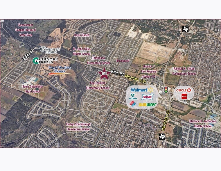 The property is situated at a lighted intersection, enhancing accessibility and visibility for potential developments. The Galm Road Phase III project is underway, expanding the current two-lane roadway into a five-lane roadway, including bike lanes and sidewalks, to improve traffic flow and connectivity.