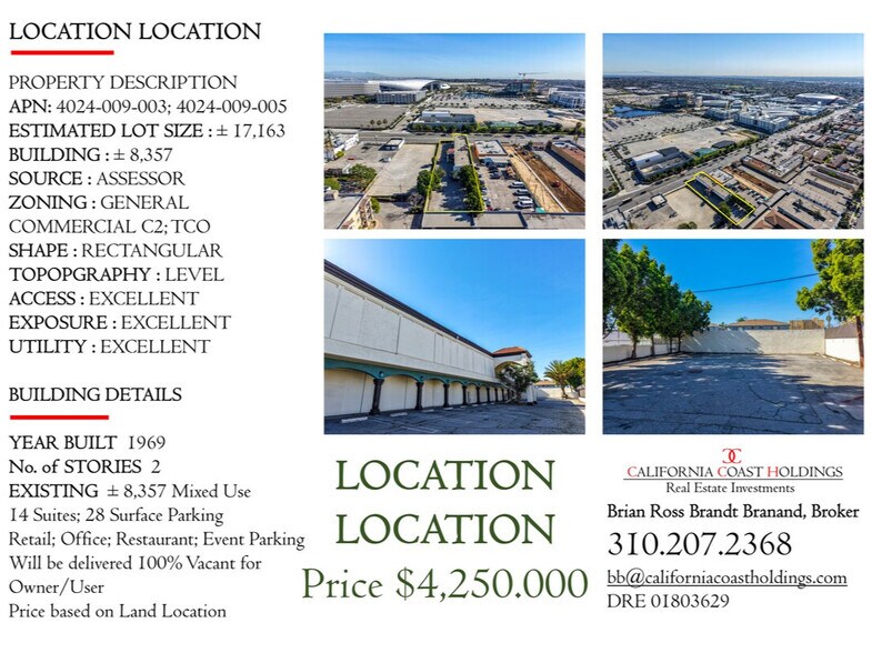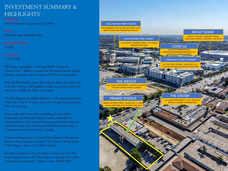 Extraordinary opportunity to acquire the fee simple interest (land & building ownership) in a ± 8,357 SF mixed-use retail center in the heart of Inglewood’s Entertainment District (Los Angeles MSA). The property is exceptionally located across from the main entrance to SoFi Stadium, the largest stadium in the NFL, with a capacity of 70,000 to 100,000, and was ranked the No. 1 stadium in the world for top-grossing concert and live event ticket sales in 2023. The improvements consist of ± 8,357 square feet of gross building area within 2 stories situated on ±17,170 SF land with great Visibility/Access on Prairie Avenue (main north/south avenue directly adjacent to Hollywood Park Development) with arterial traffic counts of 35,000 CPD. Large swath and variety of uses, including Retail, Office, Restaurant, and Parking Facilities (surface, subsurface, or structured) for use by adjacent businesses, permitted within the General Commercial C2, Medical, and/or TCO Zoning. There are 14 suites, of which all will be delivered vacant for an Owner/User and SBA Financing eligible, providing the ability to acquire the land & building with minimum 10-15% down payment requirement, at over ± 8300 existing rentable square feet with the ability for own/user to occupy 51% per SBA Guidelines while being able to lease the other over ±4,000 SF (49%) for income. The Development Standards allow for substantial development on the site. Up to 75-foot (or six story) height limit with up to 70% site coverage. Positioned for Long-Term Success; On-axis with Hollywood Park Development, the largest urban mixed-use development under construction in the Western United States, with every aspect of the 300-acre development thoughtfully curated and tailor-made to thrive in today’s evolving mixed-use environment, and within premium walking distance to and from the main entrance to SoFi Stadium for pre & post-event tourism, foot traffic, and event parking.