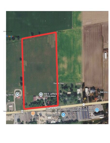 950 E Jefferson, Tipton, consists of two parcels totaling 21ac. Parcel closest to road is 3.32 ac and includes a house, and is zoned Residential. The second parcel is 17.68 ac and is zoned Agriculture. Asking price of $1.6M is for both parcels.