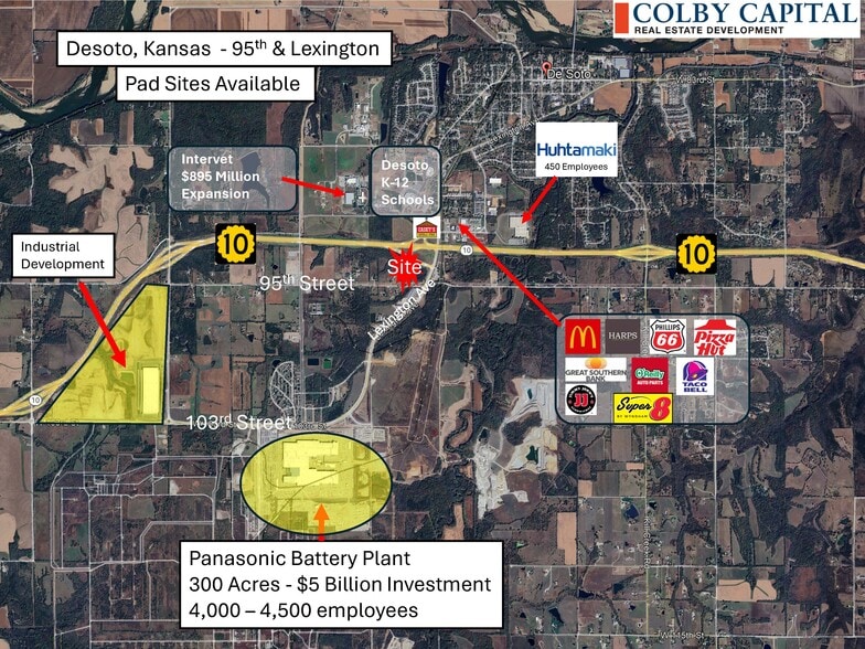 Property fronts; K-10, Lexington and 95th Street. Panasonic Battery plant is south of the Site with over 4000 employees 15-Acres in total, divided into 4 pad sites of 1 to 4 acres Perfect location for C-Store, Restaurant and Hotel