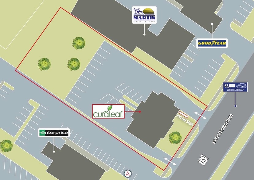 • La propriété en cause est stratégiquement située sur le boulevard San Jose, une artère principale de commerce de détail et de banlieue qui passe en moyenne 62 000 personnes par jour