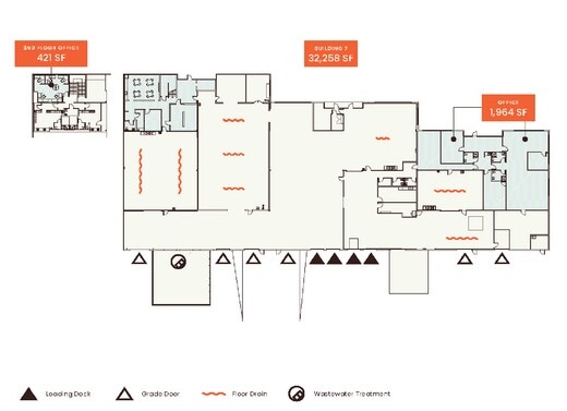 - On-site wastewater treatment; Floor drains and air-handling equipment in place; Build-ready temp-controlled production and storage areas
