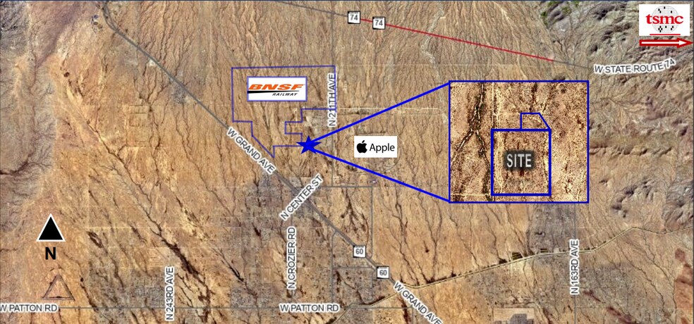 Terrain situé à la limite est et nord du site BNSF. BNSF prévoit une installation intermodale ferroviaire de 4 500 acres et la Ville de Surprise a récemment approuvé une modification de son plan général pour permettre l'industrie pour BNSF.