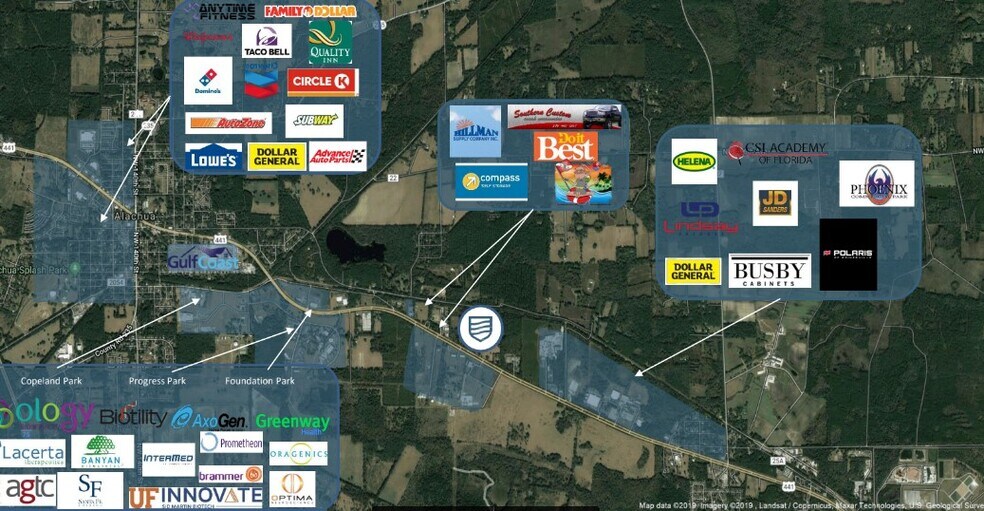 Des allées approuvées par le FDOT sont en place, y compris des voies d'accès et de décollage coûteuses, ce qui se traduit par d'importantes économies sur les coûts de développement et l'accès aux 18 000 véhicules qui empruntent quotidiennement l'autoroute 441. Le site se trouve à environ 4 milles à l'est de la I-75 et à quelques minutes du centre-ville d'Alachua et de Gainesville.