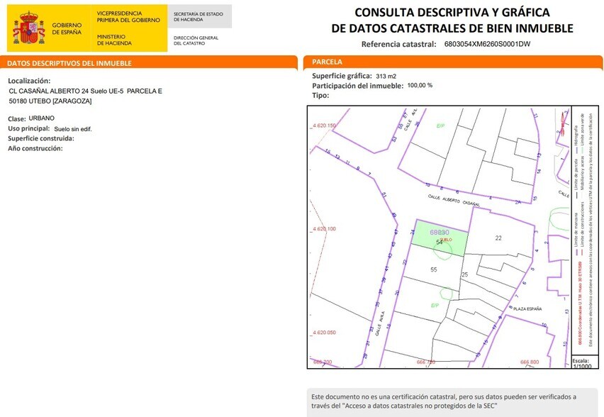 NO COBRAMOS COMISIÓN DE INTERMEDIACIÓN AL COMPRADOR ¡Una inversión estratégica con gran proyección! Ponemos a tu disposición una excelente oportunidad de adquirir en propiedad este suelo urbano residencial, ubicado en la localidad de Utebo, provincia de Zaragoza. Su ubicación, muy próxima al centro de la población, garantiza comodidad y cercanía a todo tipo de servicios, desde comercios y supermercados hasta colegios, centros de salud y espacios de ocio, lo que lo convierte en un enclave ideal para el desarrollo de proyectos residenciales. - Se trata de un suelo urbano consolidado con forma rectangular y topografía llana. - Cuenta con muro perimetral y puerta de acceso en buen estado. - Se encuentra libre de edificación. - Edificabilidad de 882,00m2. - Referencia catastral: 6803054XM6260S0001DW- Este suelo destaca por su excelente comunicación con las principales vías de la zona, lo que facilita los desplazamientos tanto hacia el núcleo urbano de Utebo como hacia municipios cercanos. Además, su proximidad con Zaragoza, situada a tan solo unos minutos en coche, multiplica el valor estratégico de la inversión al ofrecer acceso directo a todas las comodidades, oportunidades laborales y servicios propios de una gran ciudad, sin renunciar a la tranquilidad y calidad de vida de una localidad más pequeña. La localidad dispone de servicios de transporte público eficientes, incluyendo líneas de autobús y tren de cercanías, que facilitan la movilidad diaria hacia Zaragoza y otras localidades de la provincia. Hipoges es una plataforma inmobiliaria donde podrás acceder a miles de activos inmobiliarios de diferentes tipos como viviendas, locales comerciales, terrenos, nueva obra, tanto a nivel particular como para inversores. Hipoges cuenta con una amplia cartera de activos inmuebles tanto en España como en Portugal y Grecia.