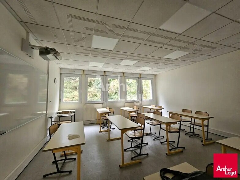 Bâtiment A : couloir, salle de détente avec point d'eau, 10 bureaux allant de 12.39 m² à 17,47 m², salle des professeurs, salle de réunion, salle de cours, local repro, sanitaires étudiants et sanitaires personnel.