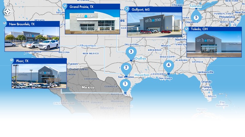 Northmarq est heureuse d'offrir à la vente à des investisseurs qualifiés la possibilité d'acheter une participation à frais simples dans cinq propriétés At Home situées au Texas, au Mississippi et en Ohio (collectivement les « propriétés » ou le « portefeuille »). Le portefeuille est loué sur une base nette triple absolue dans le cadre d'un seul contrat de bail cadre avec plus de six ans de durée de location de base restante. Le bail prévoit des augmentations annuelles de loyer de 2,00 % tout au long de la durée de base et de quatre périodes d'options, ce qui donne un coup de pouce au flux de trésorerie global du portefeuille. Le portefeuille s'étend sur 534 881 pieds carrés sur 46,30 acres.