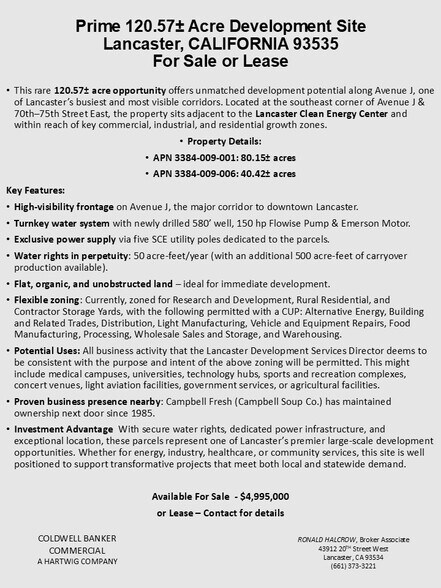 Les 2 parcelles, composées de 120,57+/- Acs., sont « À VENDRE » ou « À BAIL » et se situent dans les limites de la ville de Lancaster. Les parcelles offrent une excellente visibilité sur une avenue très fréquentée. « J », rue du couloir principal menant au centre-ville. Situé à l'angle sud-est de l'avenue. J & 70e et 75e rue Est. [APN 3384-009-001 = 80,15+/- Acs. & 3384-009-006 = 40,42+/- Acs.]. Idéal pour les hôpitaux, les campus de soins médicaux, les universités, les commerces, le commerce de détail, la technologie, la recherche et le développement, la fabrication, l'entrepôt, l'hôtellerie, les résidences, les sports, les loisirs, les pavillons de concerts, les aéroports de voyages légers, les services communautaires locaux, étatiques ou fédéraux, le développement solaire ou hydrogène ou l'agriculture. Les parcelles sont à niveau, dégagées, organiques et vacantes, avec 1 puits d'eau clé en ligne de 580 pieds nouvellement construit, et une nouvelle pompe Flowise de 150 ch et un nouveau moteur Emerson alimentés par les 5 poteaux de services électriques de SCE, qui entretiennent exclusivement les colis. L'action d'arbitrage sur les eaux souterraines d'Antelope Valley a accordé aux parcelles 50 pieds carrés. Par année en « perpétuité » et avec des « reports » totalisent maintenant 500 Ac. Pt. de production d'eau souterraine disponible. Les parcelles sont zonées en agriculture et peuvent être ajustées en fonction de la variance via l'application du Département de l'urbanisme. Les parcelles sont également voisines de Campbell Fresh [alias Campbell Soup Co.]. [Propriétaire depuis 1985]. * De plus, 2 - 10+/- Acs sont disponibles. « À VENDRE » ou « À BAIL » situé à 1/4 de mille à l'est en bas de la rue, à l'angle nord-ouest de l'avenue. « J » et 77e et 80e rue Est. [APN 3384-020-012 = 10+/- Acs. & 3384-020-013 = 10+/- Acs.]. Excellente combinaison polyvalente avec le colis de 120,57 Acs. ci-dessus. [Propriétaire depuis 1985]. * En outre, 10 +/- Acs sont disponibles. « À VENDRE » ou « À LOUER » en face de l'avenue. C & 97th St. Ouest [APN 3262-016-011]. [Propriétaire depuis 1985].