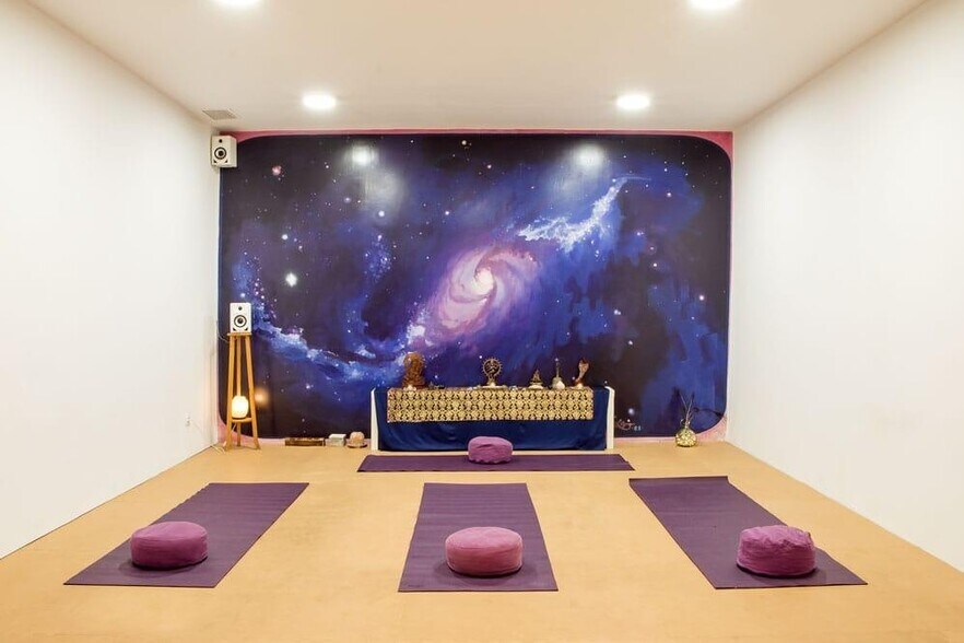 Dispone de dos tipos de suelo: panot de flor, que aporta un estilo moderno y típico de Barcelona, y pavigym, ideal para actividades físicas como yoga. También destaca su pared de piedra y el techo de bóveda catalana, que le dan un toque único y acogedor.