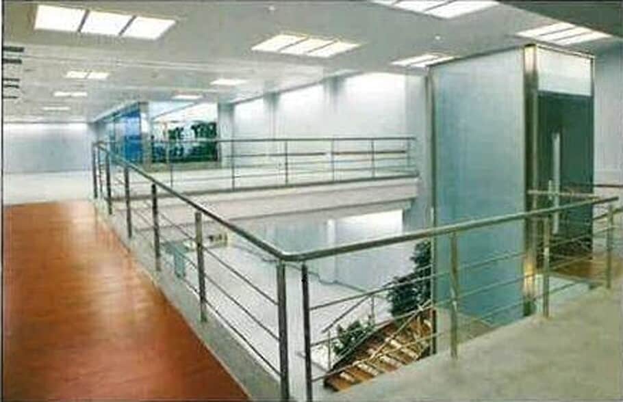La entrada conduce a una amplia zona de recepción, que da paso a dos plantas diáfanas, actualmente configuradas mediante paneles y mamparas de madera correderas, permitiendo una fácil adaptación a distintos modelos de trabajo. La distribución actual ofrece múltiples despachos, salas de reuniones y zonas de trabajo, complementadas por ocho cuartos de baño, de los cuales cinco son dobles, dos individuales y uno adaptado para personas con movilidad reducida.