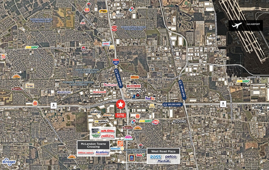 • Situé à l'angle sud-ouest de Beltway 8 (Sam Houston Tollway) et I-45 • Façade de 591 pieds le long de la promenade North Sam Houston • Comptes de circulation incroyables avec une excellente visibilité et un accès direct à l'intersection du Beltway 8 et de l'I-45 • Situé dans le principal sous-marché de North Houston, à côté du parc d'affaires Pinto, à une courte distance de l'aéroport intercontinental George Bush et de plusieurs sociétés Fortune 500, dont Sysco, United Airlines et Honeywell • Deux allées approuvées et installées par TXDOT • À l'extérieur de la plaine inondable de 500 ans