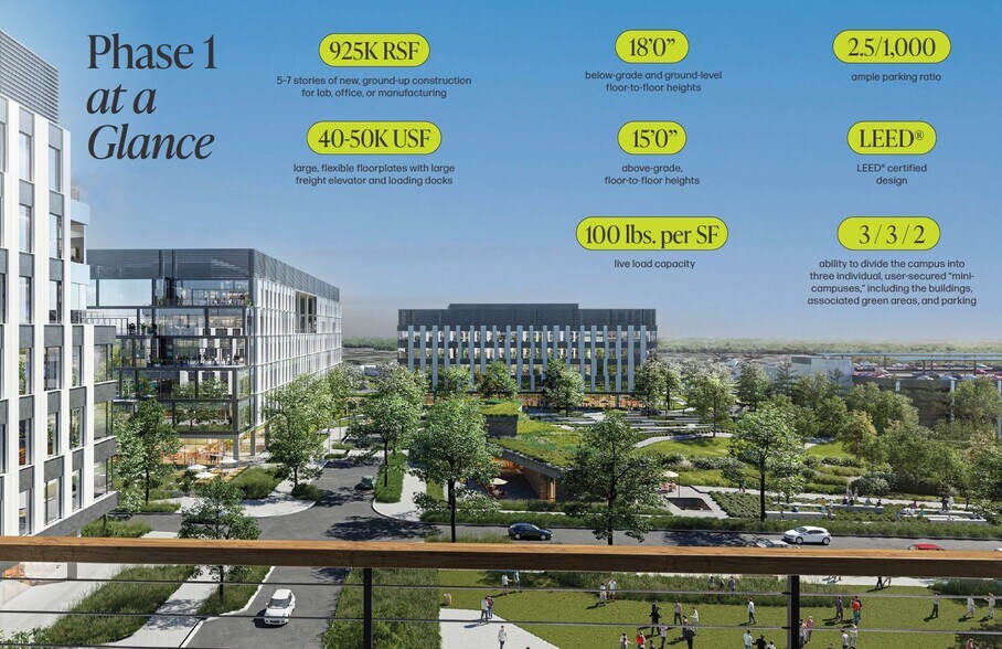 5–7 stories of new, ground-up construction for lab, office, or manufacturing. Ability to divide the campus into three individual, user-secured “minicampuses,” including the buildings, associated green areas, and parking.