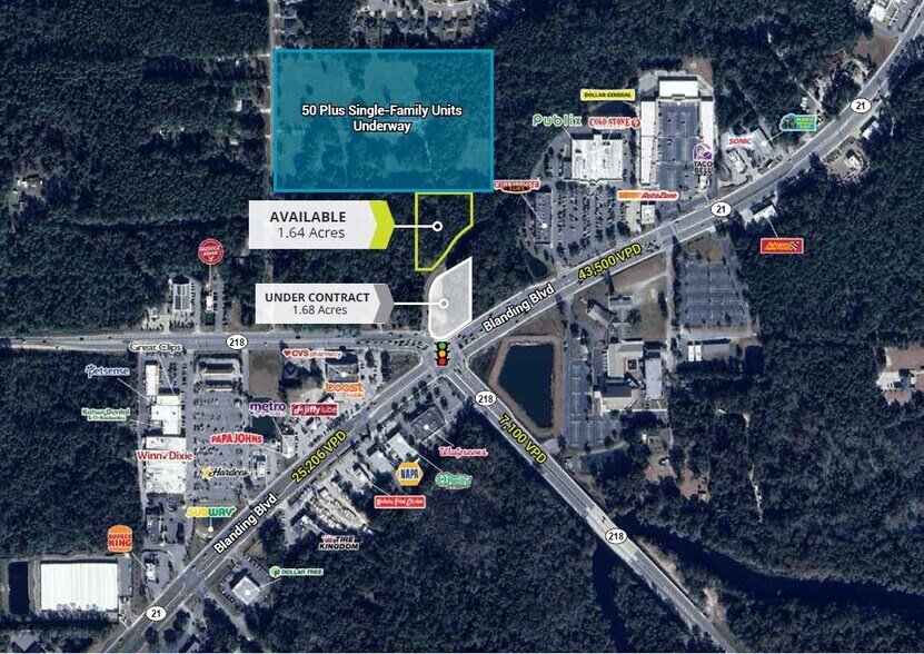 Ce terrain commercial de 1,64 acre offre une excellente visibilité et accessibilité à l'intersection de Blanding Blvd et CR 218. Zoné pour un usage commercial et situé près d'un corridor à fort achalandage, la propriété est parfaitement adaptée aux entreprises de détail ou de services. Avec un centre commercial Publix adjacent et de nouveaux développements résidentiels en cours à proximité, cet emplacement bénéficie d'une forte demande des consommateurs et d'un flux de circulation soutenu.