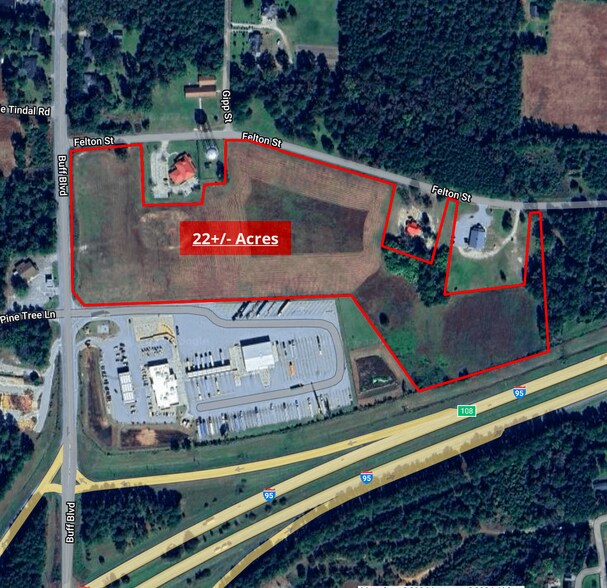 22+/- acres de terrain grossièrement défriché situé à la sortie 108 en direction de Summerton avec 552 pieds de façade sur l'I-95. Eau et égout disponibles.