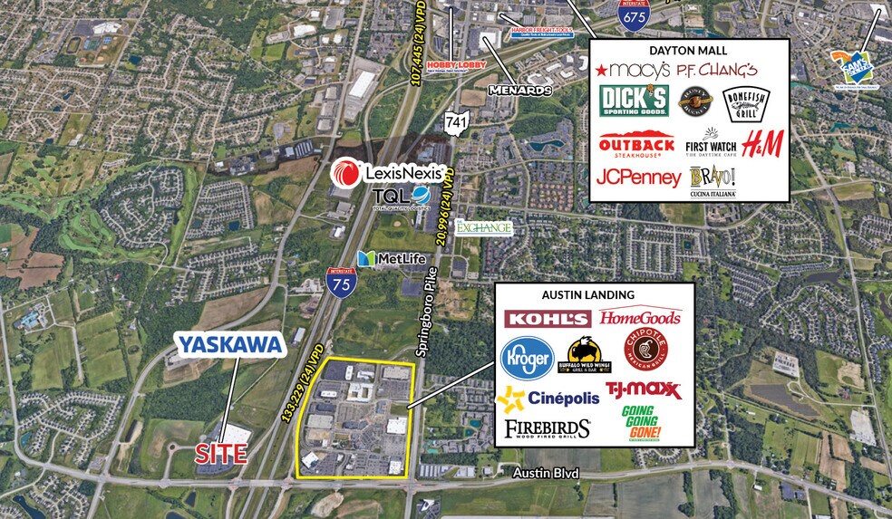 1 - 9,4 acres disponibles pour le développement. Idéal pour les bureaux, les commerces de détail, les restaurants et les pharmacies. Zoné PD-5 à usage mixte planifié. Stratégiquement situé juste à l'ouest de l'échangeur I-75/Austin Blvd. (sortie 41), le plus récent corridor de développement commercial I-75 du sud-ouest de l'Ohio entre Dayton et Cincinnati. Accès routier immédiat à I-75 et I-675. Utilitaires disponibles. Situé à côté de Miami Valley Hospital/Premier Health 12 lits, centre d'urgence 24 heures et 106 suites Home 2 Suites by Hilton.