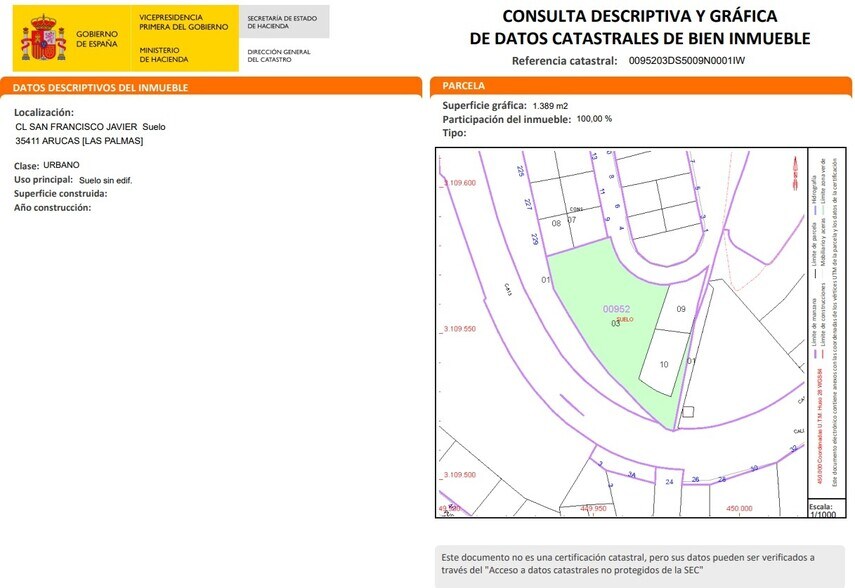 NO COBRAMOS COMISIÓN DE INTERMEDIACIÓN AL COMPRADOR ¡Oportunidad de inversión en un entorno privilegiado de Gran Canaria! Te presentamos esta finca rústica en la localidad de Arucas, provincia de Las Palmas, una excelente oportunidad para inversores o particulares que buscan un activo en una zona con gran proyección, rodeada de naturaleza y con buena conexión a la capital. -Superficie del suelo: 422m². -Clasificación: Suelo rústico. -Categoría: Suelo Rústico Potencialmente Productivo - Cultivos Continuos (S.R.p.p.-c.c.) -Referencia catastral: 0095203DS5009N0001IW. -Uso principal vinculado a explotación agrícola o aprovechamiento rústico. -Se trata de una parcela con valor estratégico a medio y largo plazo, ideal para: .Uso agrícola o explotación de cultivos. .Inversión patrimonial en suelo con posible evolución urbanística. .Desarrollo de proyectos compatibles con la normativa vigente. Ubicada en calle San Francisco Javier, esta parcela se sitúa en un entorno tranquilo, con proximidad a núcleos urbanos consolidados y a menos de 15 minutos de Las Palmas de Gran Canaria a través de la GC-2. La zona dispone de servicios esenciales cercanos como supermercados, centros educativos, transporte público y comercios, lo que incrementa su atractivo. Arucas destaca por su valor patrimonial, su entorno natural y su creciente demanda residencial, convirtiéndose en una de las localidades más interesantes para invertir en la isla. Hipoges es una plataforma inmobiliaria donde podrás acceder a miles de activos inmobiliarios de diferentes tipos como viviendas, locales comerciales, terrenos, nueva obra, tanto a nivel particular como para inversores. Hipoges cuenta con una amplia cartera de activos inmuebles tanto en España como en Portugal y Grecia.