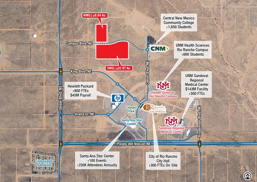 Development will require a site development plan Located adjacent to CNM Rio Rancho, UNM Health Sciences Rio Rancho, Rio Rancho City Hall and Hewlett Packard Amenities include Campus Park and Santa Ana Star Center