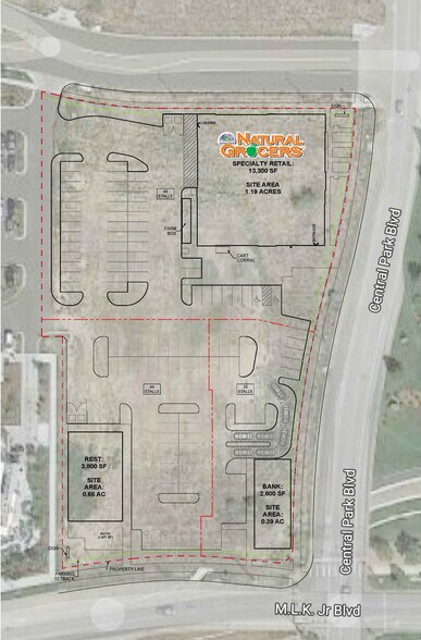 Possibilités de bail foncier et de construction sur site disponibles. • Grande visibilité depuis Martin Luther King Jr et Central Park Blvd. • Emplacement idéal pour les banques, les restaurants et les commerces de quartier. • Joignez-vous à Natural Grocers.