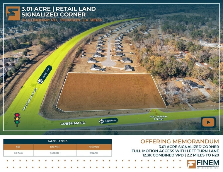 The Finem Group at Meybohm Commercial is pleased to exclusively present 00 Cobbham Road NE, a ±3.10-acre commercial corner parcel in Thomson, Georgia.