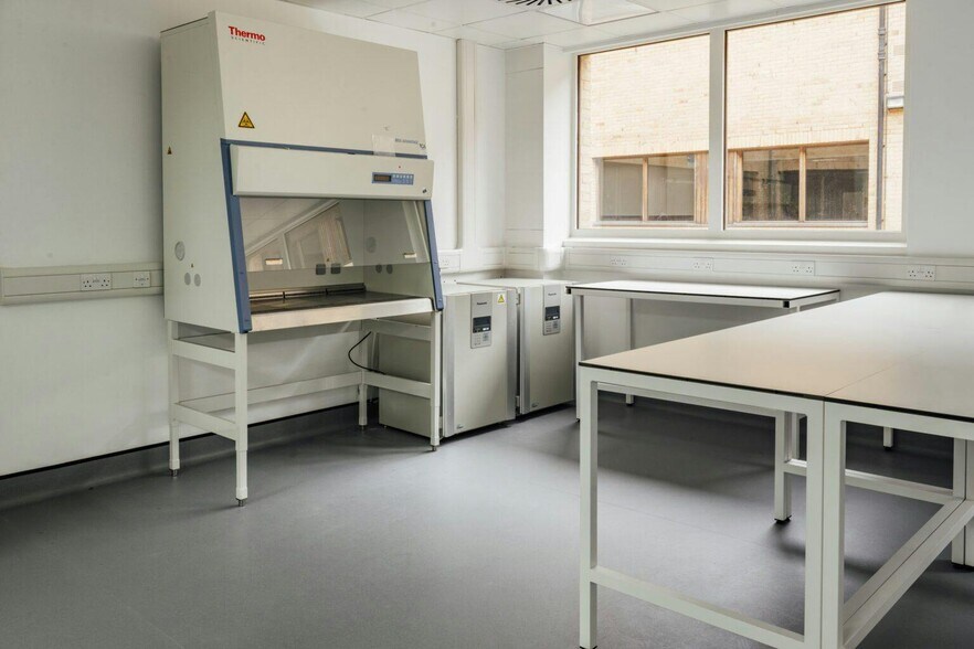 Ground floor offers amenities including open access labs, a café and restaurant, communal breakout areas and courtyard garden