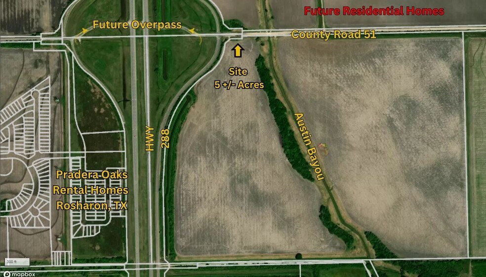 Located approximately 2 miles south of FM 1462, this property is situated at the strategic intersection of HWY 288 and County Road 51, with a future overpass planned by TXDot. This site offers an exceptional investment potential for commercial enterprises, convenience stores, or other business ventures. Surrounded by residential homes and upcoming subdivisions, the property promises a thriving customer base. Additional land is available to meet buyers' specific needs. Positioned across from Pradera Oaks Home, this location is poised for significant growth and development.