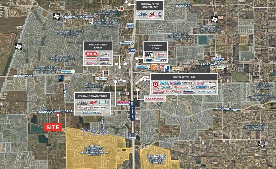 ±7 acres en bordure de la route de comté 59 dans une zone à forte croissance dans la ville de Pearland, ETJ À moins de 1 mille des collectivités planifiées de Shadow Creek Ranch, Southern Trails, Pomona, Southern Oaks et South Fork Les constructeurs actifs dans la région comprennent Perry Homes, Newmark Homes, Beazer, KB Home, Ashton Woods, Coventry, David Weekley, Trendmaker, Highland Homes Le nouveau commerce de détail dans un rayon de 1,5 mile comprend Costco, WalMart Neighborhood Grocery, CVS, Pearland Town Center et bien d'autres Excellent pour le commerce de détail, le libre-entreposage, l'éducation, les services municipaux, les églises et les entreprises occupées par le propriétaire