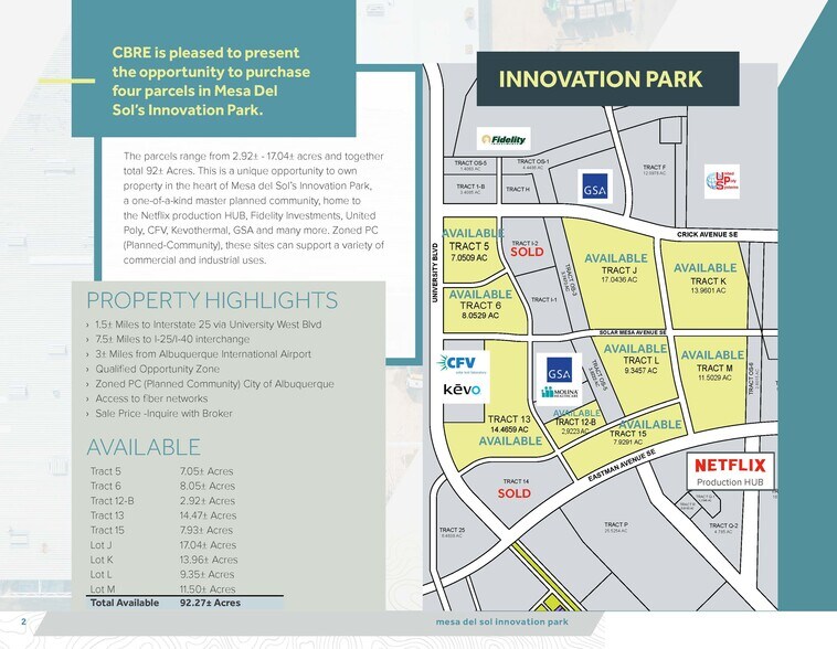Il s'agit d'une occasion unique de posséder une propriété au cœur du parc d'innovation de Mesa del Sol, une communauté planifiée unique en son genre, qui abrite le HUB de production Netflix, Fidelity Investments, United Poly, CFV, Kevothermal, GSA et bien d'autres. Zonés PC (Communauté planifiée), ces sites peuvent servir à diverses utilisations commerciales et industrielles. Les parcelles varient de 2,92 ± à 17,04 ± acres et totalisent 92 ± acres › 1,5 milles jusqu'à l'Interstate 25 via University West Blvd › 7,5± milles jusqu'à l'échangeur I-25/I-40 › 3 ± milles de l'aéroport international d'Albuquerque › Zone d'opportunités qualifiées › PC zoné (communauté planifiée) Ville d'Albuquerque › Accès aux réseaux de fibre optique Mesa del Sol est une communauté planifiée à usage mixte de 12 900 acres située à Albuquerque, au Nouveau-Mexique. Elle est entourée de grands employeurs d'Albuquerque, dont la base aérienne de Kirtland, Sandia National Labs et Netflix.