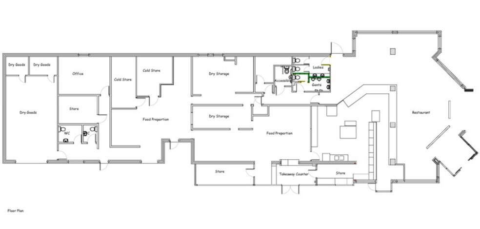 A detached single storey building with extensive window frontages. Externally, there is a car park for approximately 65 cars, with outside patio/ seating area created, and a compound suitable for future development. The property was latterly used as a restaurant premises and comprises; Entrance foyer, restaurant area, food preparation areas, takeaway counter, male, female and disabled toilets, various rooms used for office and staff toilets. The space remains largely fitted out.