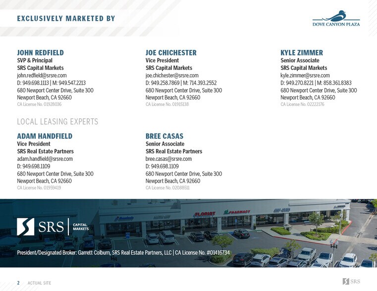 SRS Capital Markets is pleased to present the exclusive opportunity to acquire Dove Canyon Plaza, a 65,677 SF anchored retail center situated at the gateway to two of South Orange County’s most coveted gated communities — Dove Canyon and Coto de Caza. This fee simple offering represents a rare chance to own institutionally positioned retail real estate in a submarket defined by extreme wealth concentration, physical land constraints, and virtually zero new commercial supply. In addition, Dove Canyon Plaza has recently undergone comprehensive capital improvements including full exterior repainting and parking lot restriping, and the property presents in institutional condition.