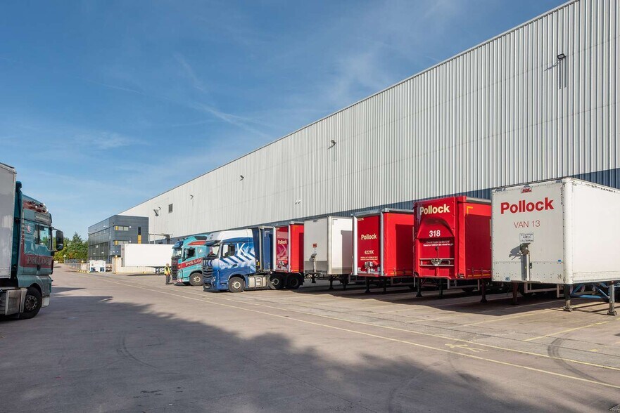 La propriété comprend une unité moderne à haute baie à ossature de portique en acier sous un toit en tôle profilé isolé avec des feux de toit translucides. L'unité bénéficie d'une hauteur d'avant-toit de 15 m s'élevant à 18 m au sommet, d'un éclairage à DEL, d'un chargement au sol de 65 kN/m², de 28 portes au niveau du quai, de 2 portes d'accès et d'une alimentation électrique importante de 4 MVA.
