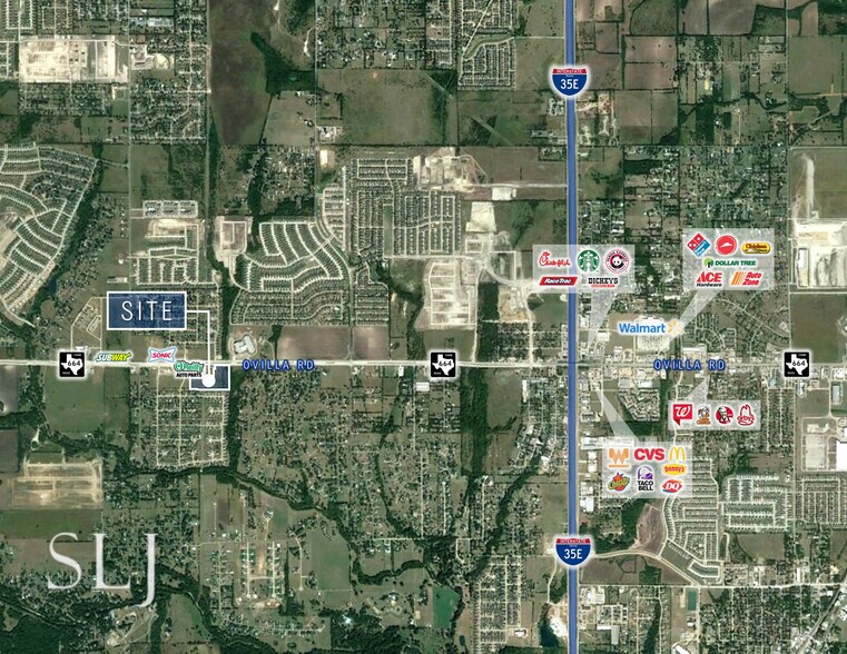 EXCELLENTE EMPLACEMENT : La propriété bénéficie d'un emplacement privilégié sur le chemin E Ovilla, entre les chemins Hampton et Uhl Rd, à Glenn Heights, TX. Il se trouve à seulement un mille et demi de l'Interstate 35E et offre une grande visibilité et un excellent accès. SITE DE DÉVELOPPEMENT PREMIER : La propriété en cause consiste en une parcelle d'environ 9,951 acres dans le district de zonage de Glenn Heights Retail, qui permet une variété d'utilisations au détail, aux bureaux et aux services. Les restaurants avec ou sans service au volant sont autorisés avec un SUP. Un plan conceptuel de l'emplacement a été achevé pour accueillir trois aires de restaurant le long de la façade du chemin Ovilla et un site plus grand à l'arrière de la propriété. POPULATION FORTE : De 2010 à 2020, la population dans un rayon de 1 mille de la propriété a connu une croissance de 63,46 %. La population de cette même région devrait augmenter de 24,33 % entre 2022 et 2027. L'augmentation de la densité de population dans la région en fait un endroit idéal pour le développement commercial. Nombreux chauffeurs de la circulation : Les détaillants à proximité comprennent Walmart, Starbucks, Brookshire, CVS Pharmacy, Walgreens, Ace Hardware, Family Dollar, Dollar General, McDonald's, Racetrac et Walmart Neighbourhood Market, entre autres.