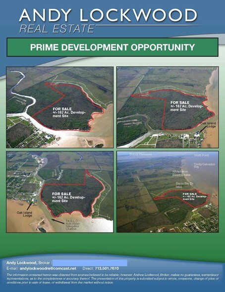 Site de développement principal, côté est de la baie de la Trinité, à environ 15 milles au sud de l'I-10E sur la FM 563 en passant par Anahuac jusqu'à Oak Island et Double Bayou.