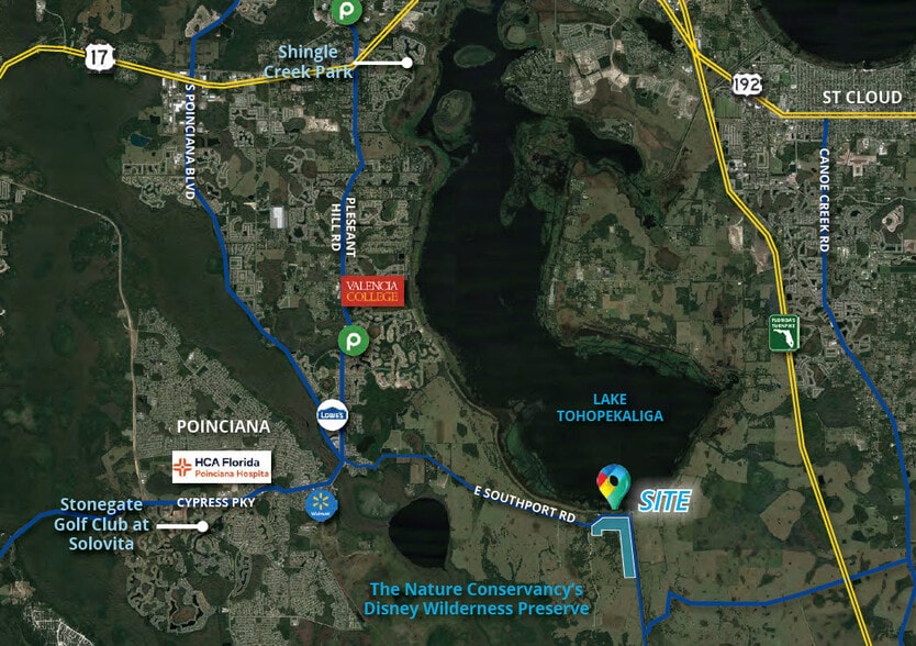 La propriété en question se compose de quatre parcelles situées dans la région de Kissimmee, dans la région de la région métropolitaine d'Orlando. Composé de 238 acres, le le site se trouve à l'extrémité sud du lac Tohopekaliga, également appelé lac Toho, connu pour sa pêche à l'achigan et son observation des oiseaux. En raison de la proximité de Kissimmee, le lac attire chaque année une multitude de touristes.